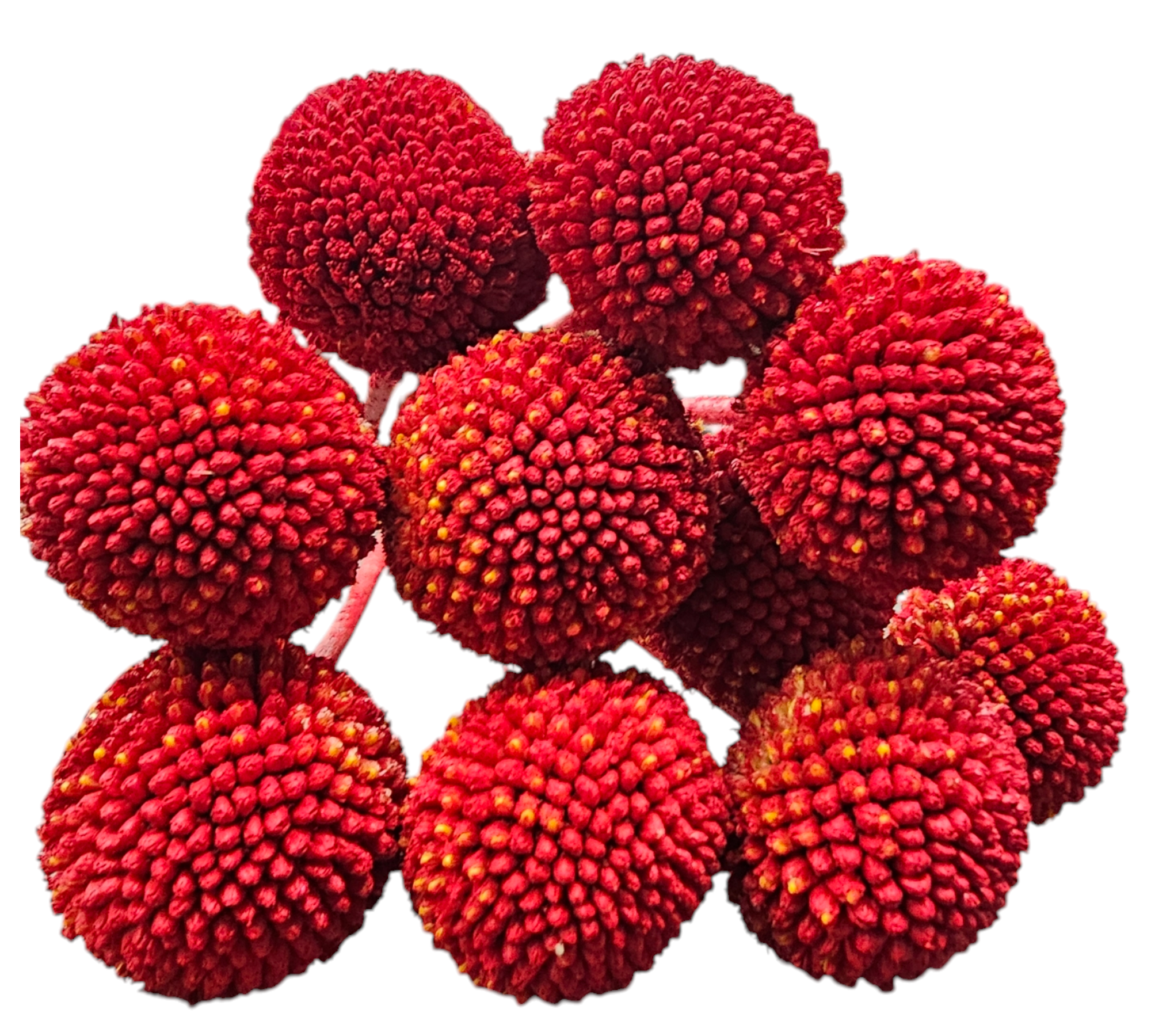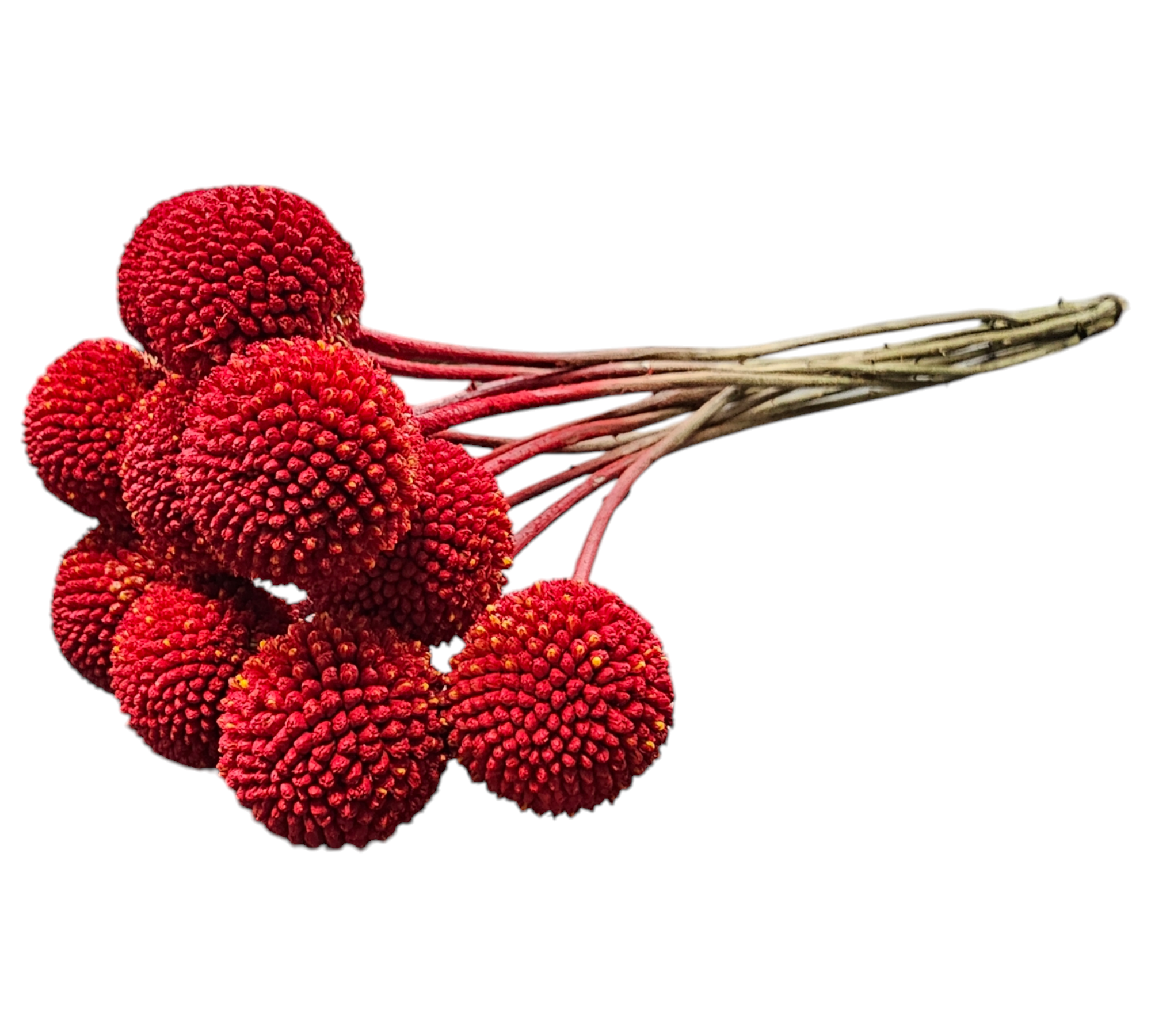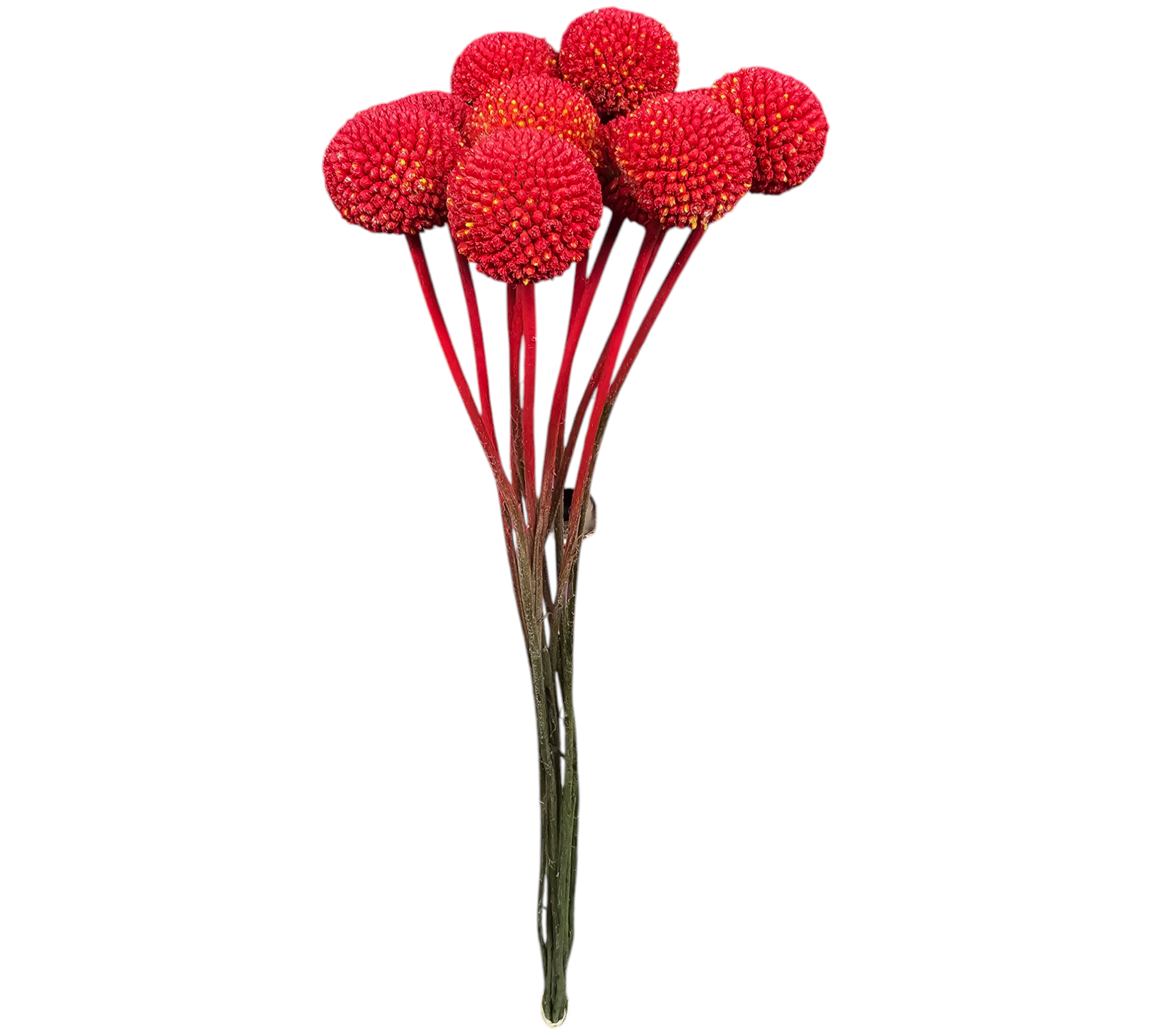 Craspedia, also known as Billy Buttons, is a striking and versatile flower, tinted in a vibrant red color. Perfect for adding a festive and bold touch to holiday decor or creating captivating seasonal arrangements. Its spherical blooms and vivid finish make it a favorite for Christmas and holiday-themed designs. -