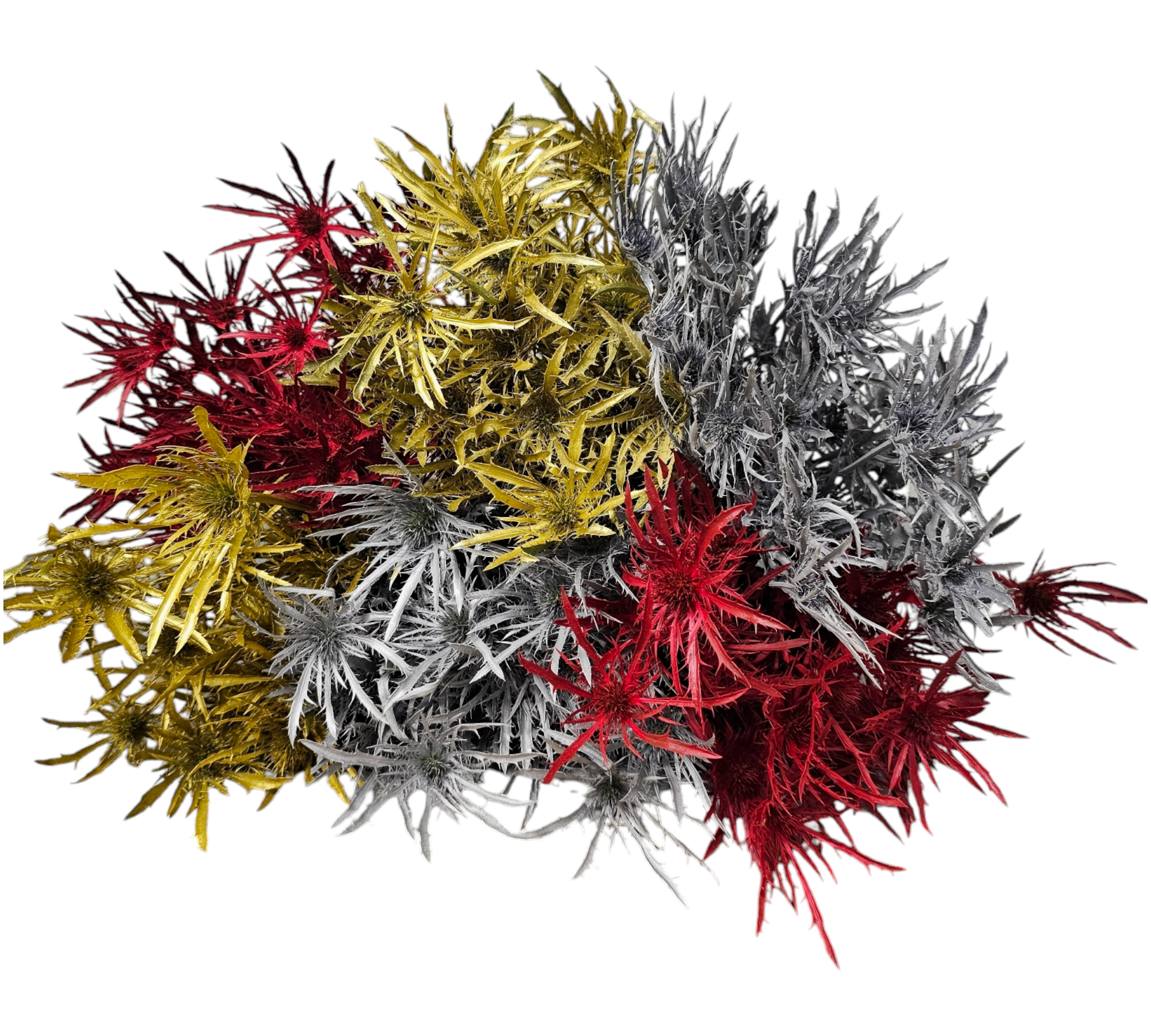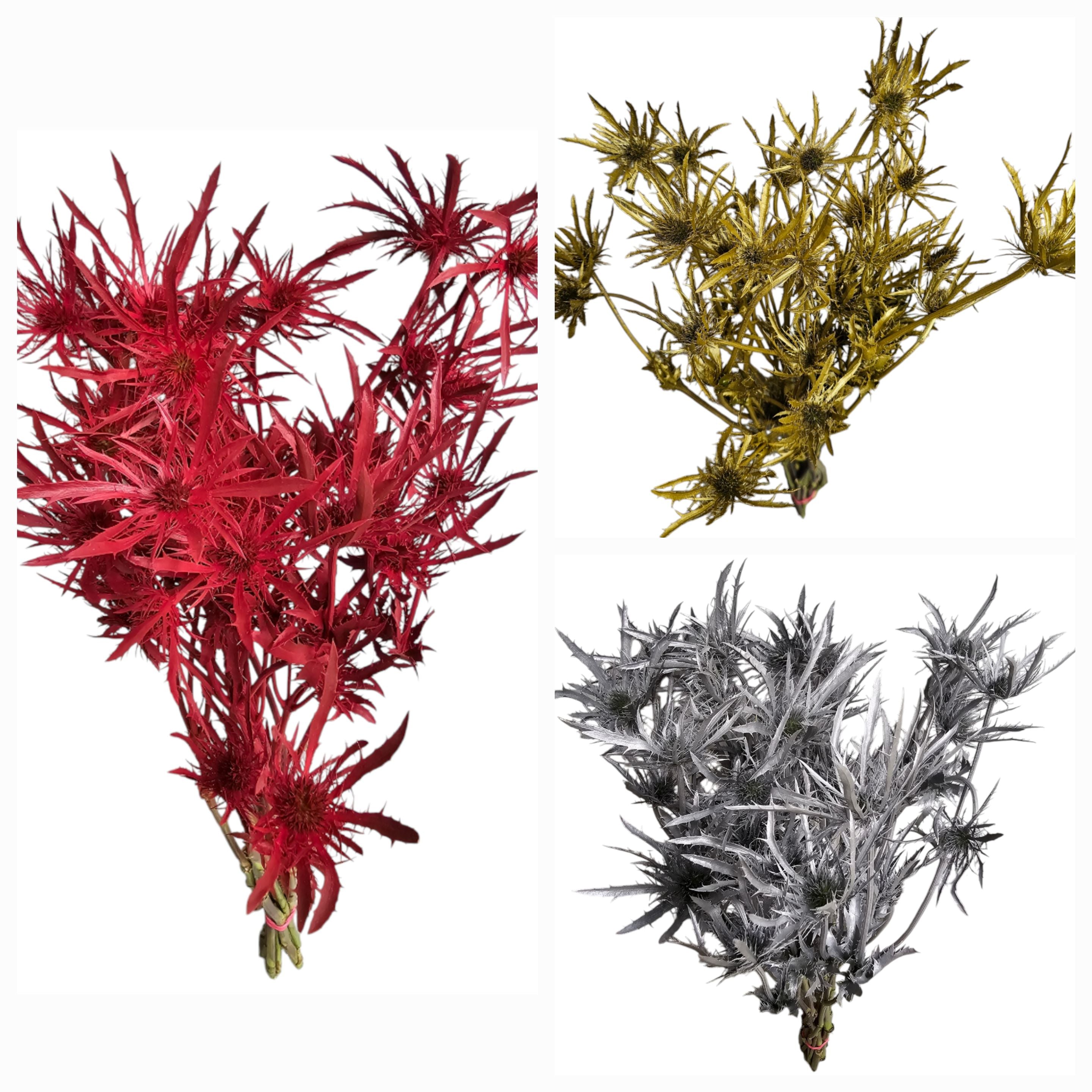 Celebrate the holiday season with our Eryngium Assorted Christmas Box, featuring a stunning mix of festive colors: 3 bunches of vibrant red, 3 bunches of metallic gold, and 2 bunches of shimmering silver. This carefully curated assortment is perfect for creating striking holiday floral designs, wreaths, centerpieces, and event decor that embody the spirit of Christmas.